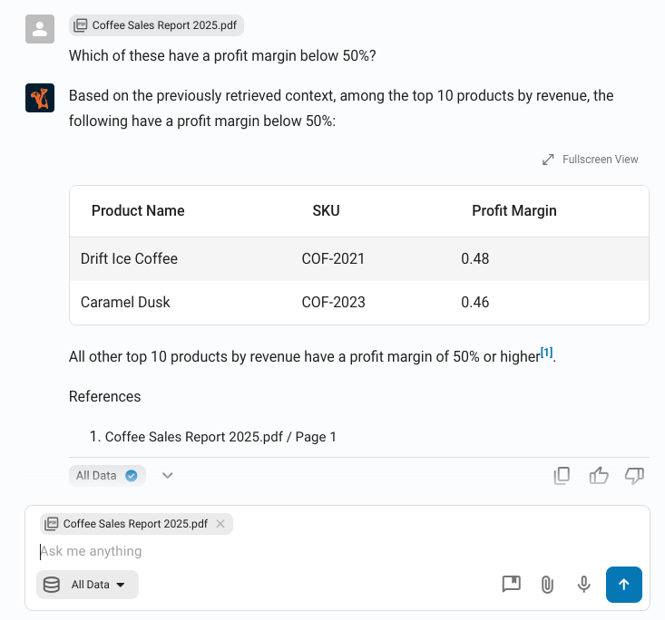 - On-the-Fly Analysis: You can drag-and-drop a CSV file – or a PDF file containing a table – directly into the chat. The system processes it immediately, no pre-indexing required, and you can start asking questions about its contents.